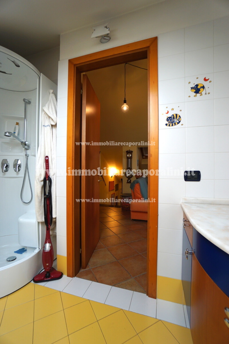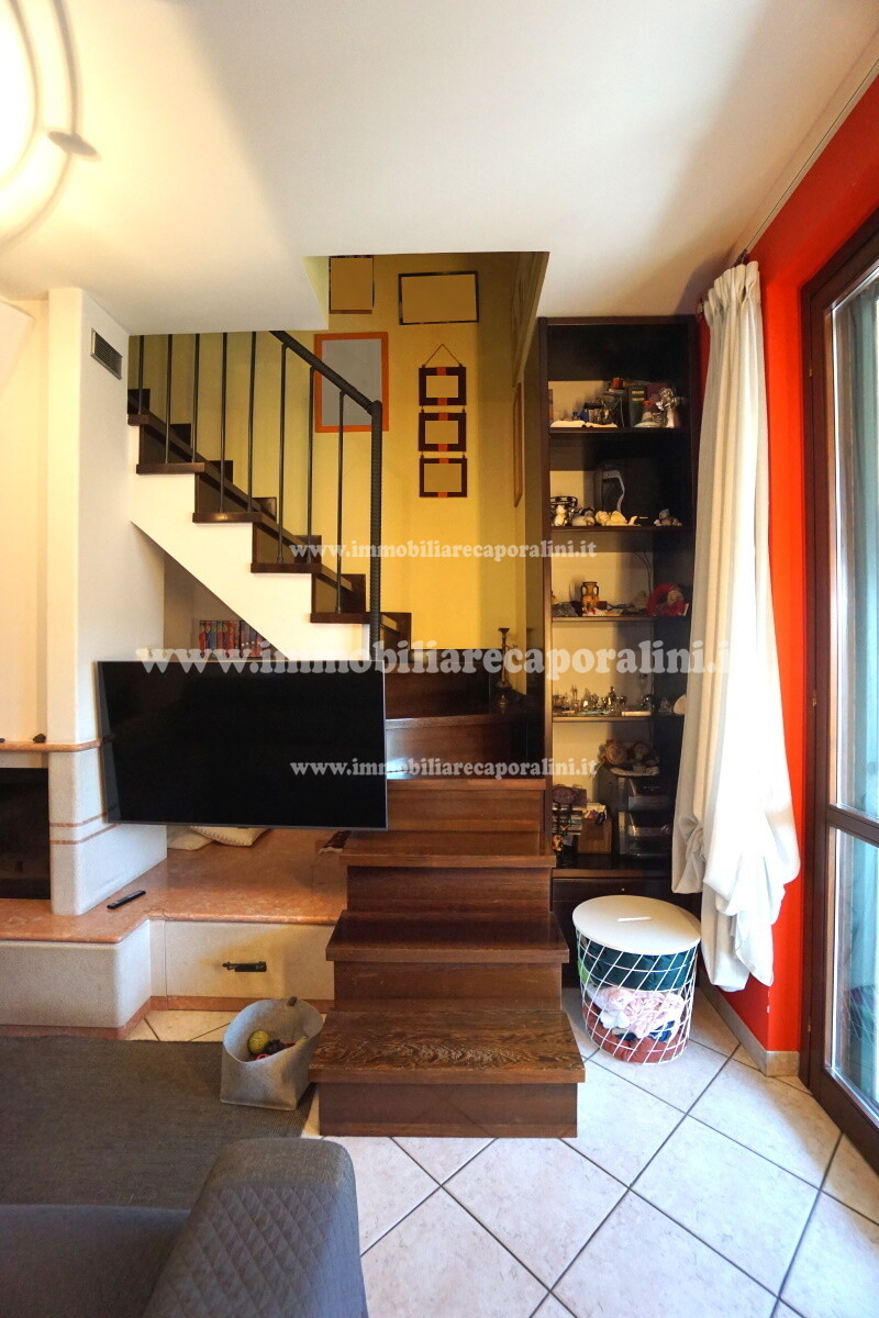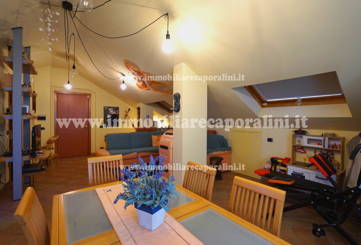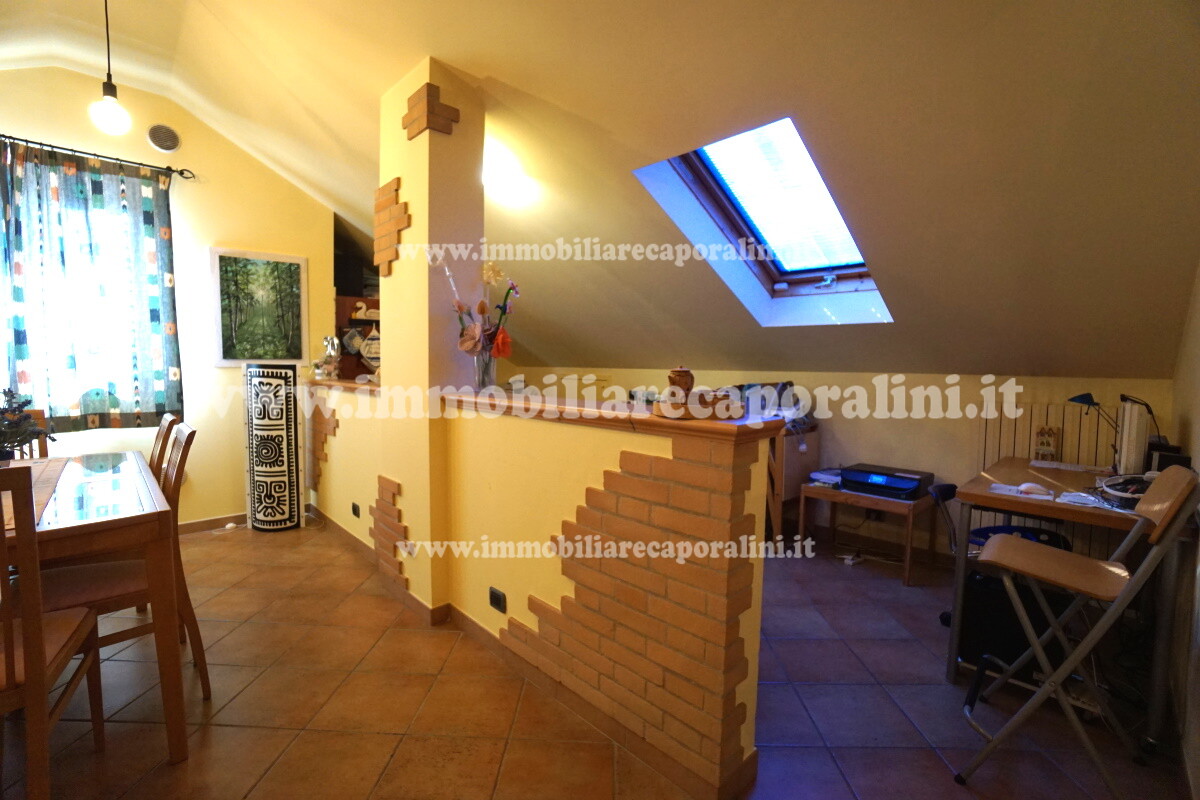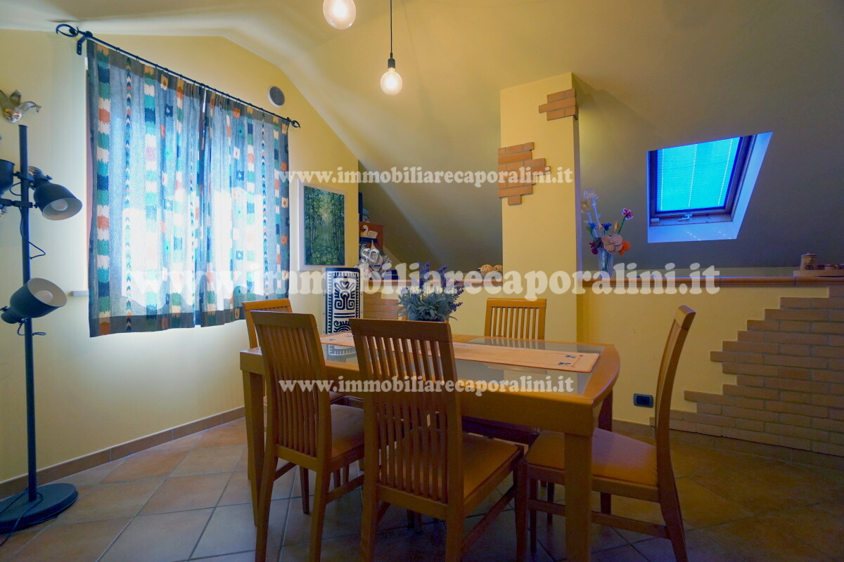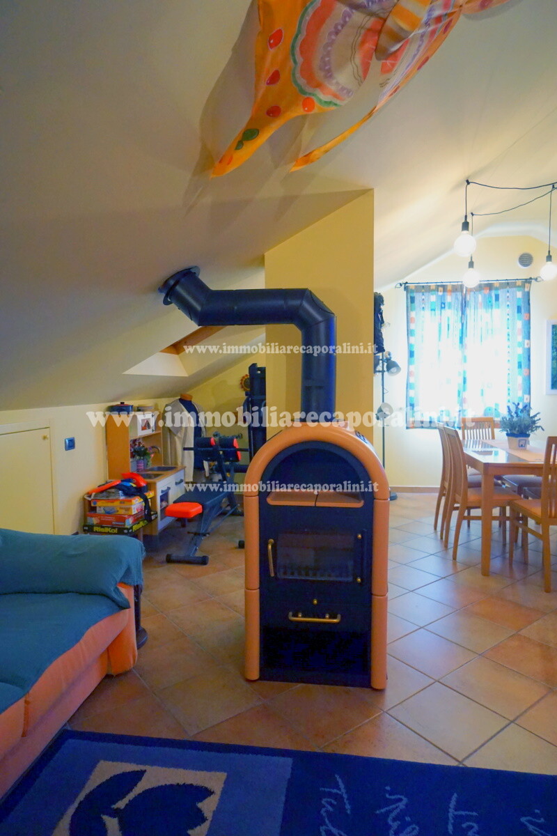 L’Agenzia Immobiliare Caporalini propone in vendita a Montecassiano (MC): zona Sambucheto, abitazione su 2 livelli caratterizzata da appartamento di circa 90 mq al piano secondo (2) con scala interna di accesso al locale sottotetto annesso di circa 50 mq al piano terzo (3) più garage di circa 30 mq al piano primo sottostrada (S1). L’immobile è composto da: ingresso, zona cucina-soggiorno (open-space) con balcone e caminetto a legna ventilato, disimpegno zona-notte, 1 camera matrimoniale con balcone, 2 camere singole, 2 bagni, scala interna di accesso al locale sottotetto pluriuso (completo di impianti, di buone finiture interne, comprensivo di tinello-cucina e di bagno/lavanderia e di ingresso indipendente) e garage. L’immobile è dotato di: impianto di riscaldamento termoautonomo con caldaia a condensazione e termosifoni; climatizzazione estate/inverno per la zona soggiorno-cucina; pavimentazioni e rivestimenti in ceramica/gres-porcellanato e parquet; infissi in legno con doppi-vetri termici e zanzariere; portoncino blindato; 2 bagni recentemente ristrutturati a nuovo; caminetto a legna ventilato canalizzato con bocchette per la diffusione di aria calda per la zona soggiorno-cucina e per la zona notte; tenda da sole per il balcone della zona soggiorno-cucina; stufa a legna nel locale sottotetto; impianto di allarme; finiture esterne in mattoncino faccia-vista e intonaco. L’immobile si trova in ottime condizioni. Contesto condominiale. Palazzina dotata di ascensore. Costruzione antisismica con struttura portante in cemento armato. Classe Energetica “D”, EPgl,nren 91,40 kWh/mq anno. Zona residenziale e servita. Occasione!