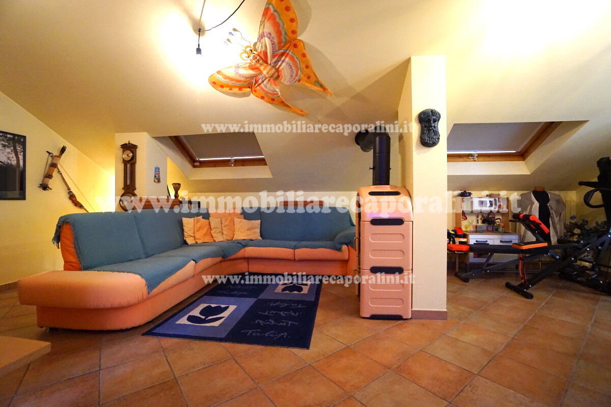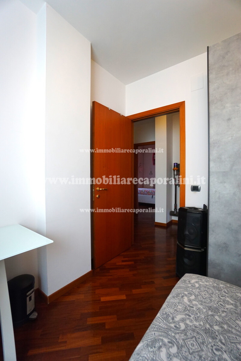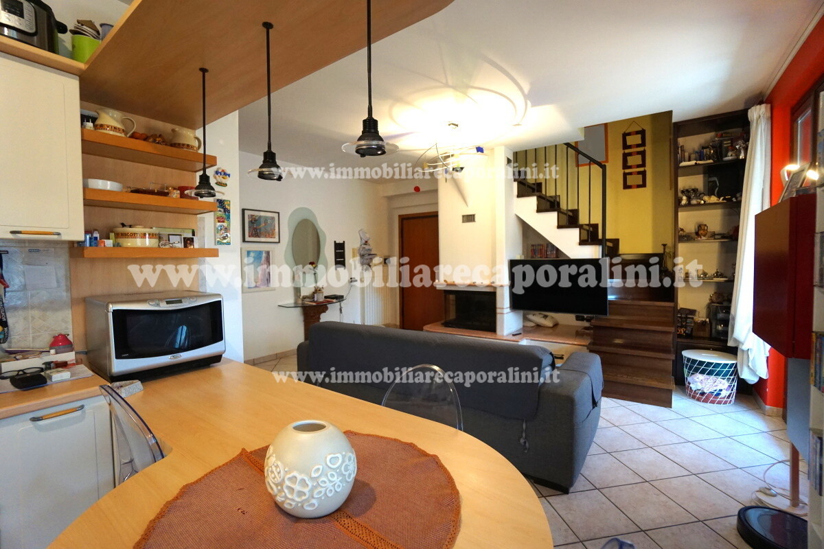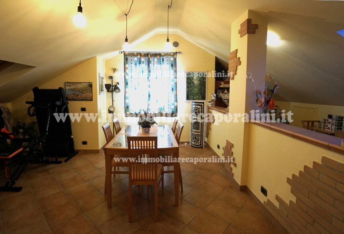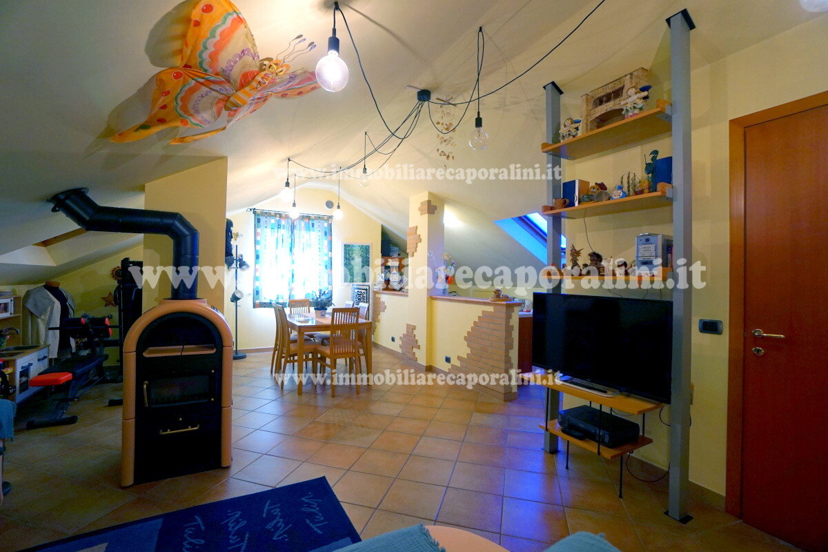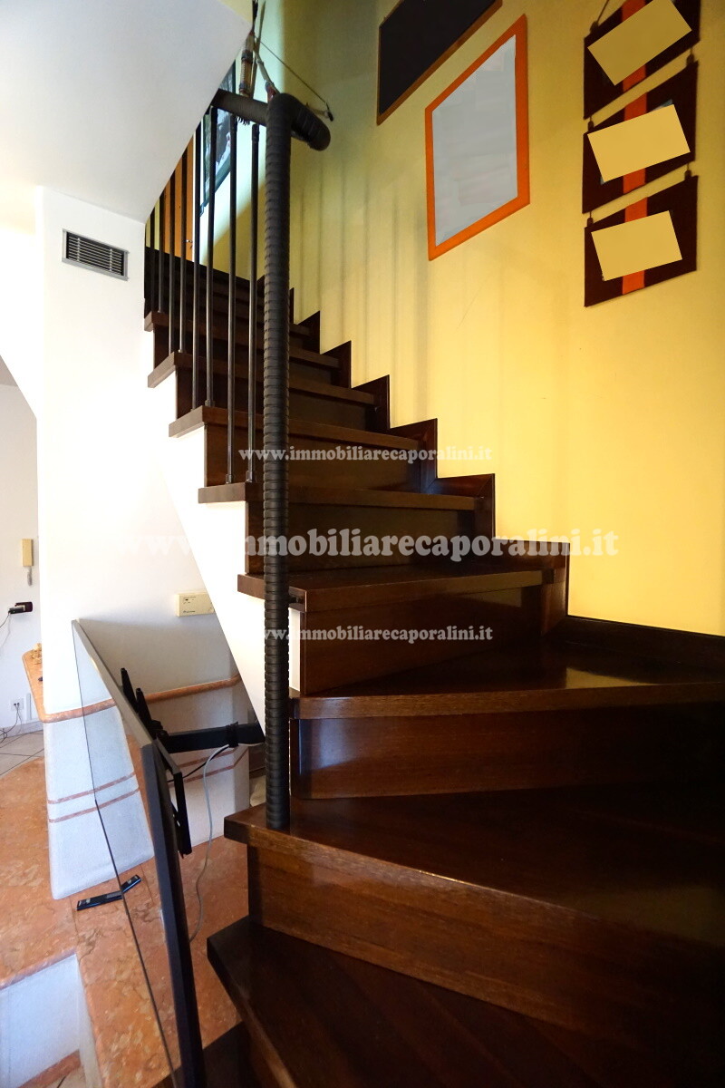L’Agenzia Immobiliare Caporalini propone in vendita a Montecassiano (MC): zona Sambucheto, abitazione su 2 livelli caratterizzata da appartamento di circa 90 mq al piano secondo (2) con scala interna di accesso al locale sottotetto annesso di circa 50 mq al piano terzo (3) più garage di circa 30 mq al piano primo sottostrada (S1). L’immobile è composto da: ingresso, zona cucina-soggiorno (open-space) con balcone e caminetto a legna ventilato, disimpegno zona-notte, 1 camera matrimoniale con balcone, 2 camere singole, 2 bagni, scala interna di accesso al locale sottotetto pluriuso (completo di impianti, di buone finiture interne, comprensivo di tinello-cucina e di bagno/lavanderia e di ingresso indipendente) e garage. L’immobile è dotato di: impianto di riscaldamento termoautonomo con caldaia a condensazione e termosifoni; climatizzazione estate/inverno per la zona soggiorno-cucina; pavimentazioni e rivestimenti in ceramica/gres-porcellanato e parquet; infissi in legno con doppi-vetri termici e zanzariere; portoncino blindato; 2 bagni recentemente ristrutturati a nuovo; caminetto a legna ventilato canalizzato con bocchette per la diffusione di aria calda per la zona soggiorno-cucina e per la zona notte; tenda da sole per il balcone della zona soggiorno-cucina; stufa a legna nel locale sottotetto; impianto di allarme; finiture esterne in mattoncino faccia-vista e intonaco. L’immobile si trova in ottime condizioni. Contesto condominiale. Palazzina dotata di ascensore. Costruzione antisismica con struttura portante in cemento armato. Classe Energetica “D”, EPgl,nren 91,40 kWh/mq anno. Zona residenziale e servita. Occasione!