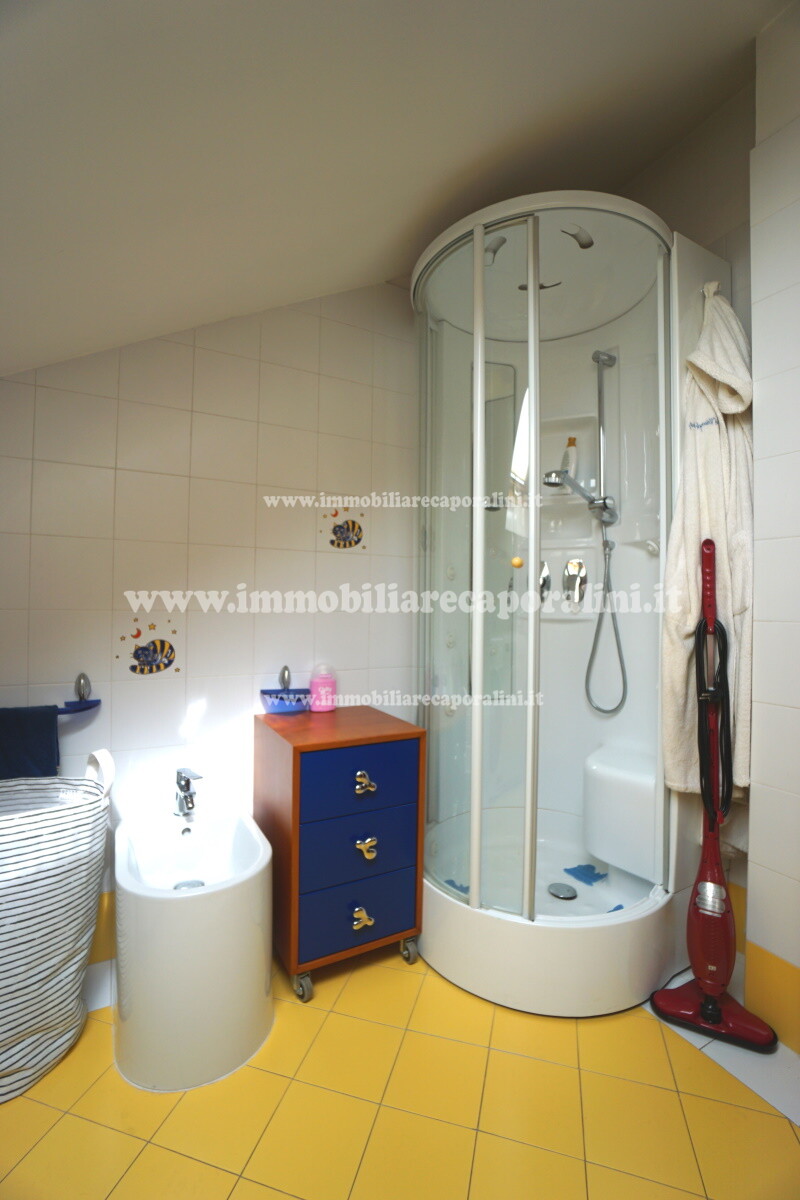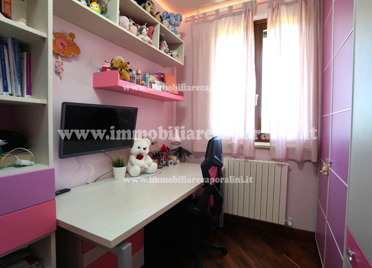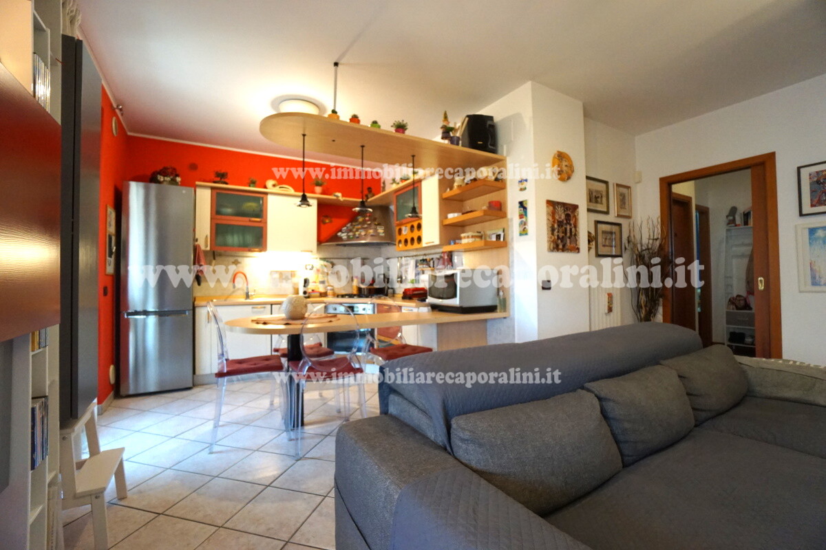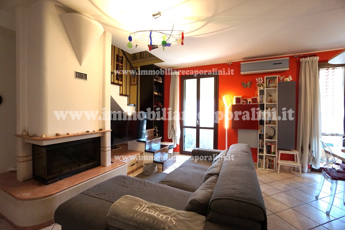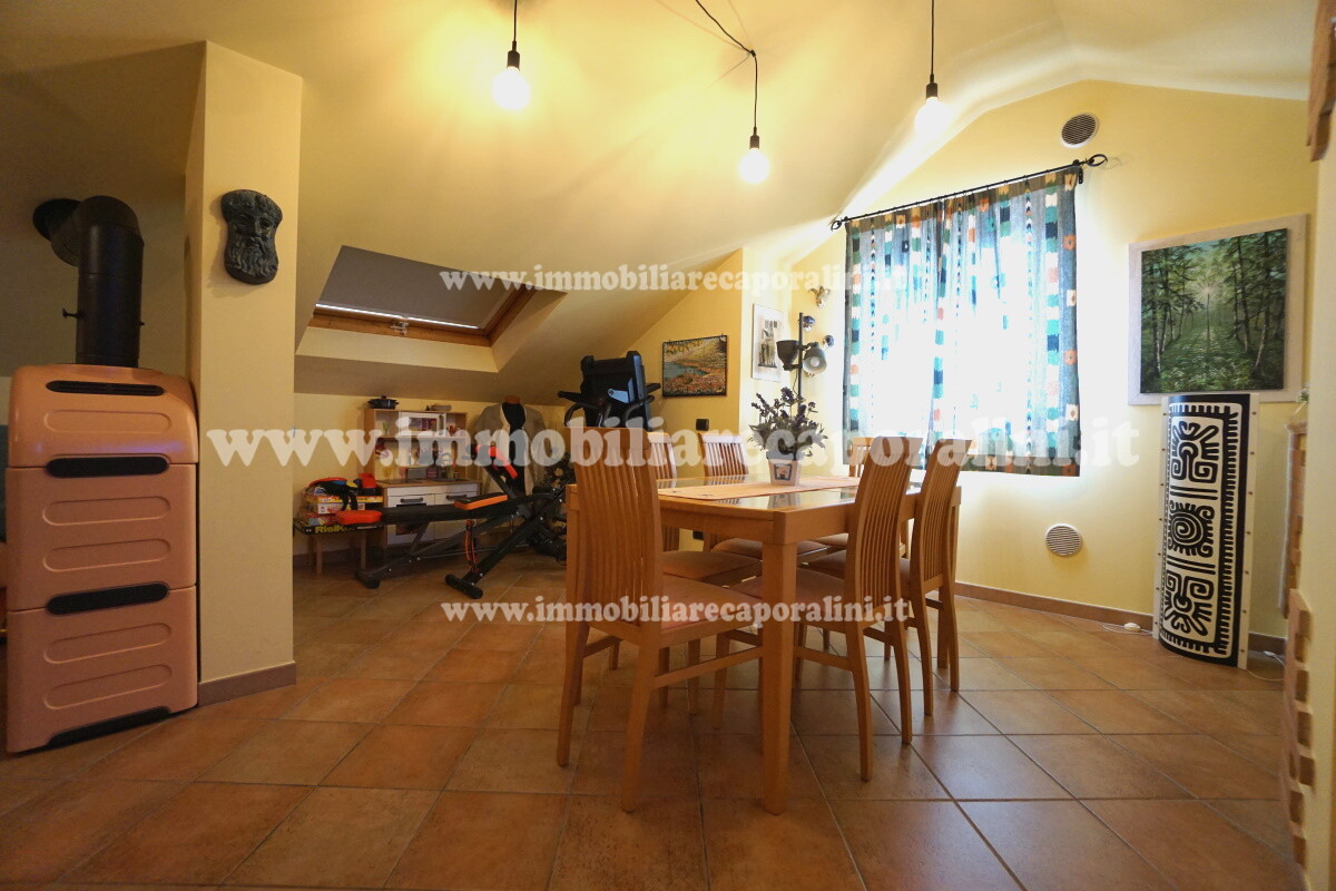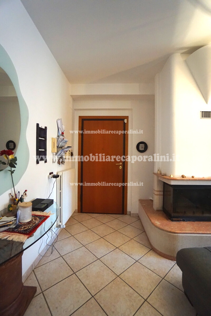 L’Agenzia Immobiliare Caporalini propone in vendita a Montecassiano (MC): zona Sambucheto, abitazione su 2 livelli caratterizzata da appartamento di circa 90 mq al piano secondo (2) con scala interna di accesso al locale sottotetto annesso di circa 50 mq al piano terzo (3) più garage di circa 30 mq al piano primo sottostrada (S1). L’immobile è composto da: ingresso, zona cucina-soggiorno (open-space) con balcone e caminetto a legna ventilato, disimpegno zona-notte, 1 camera matrimoniale con balcone, 2 camere singole, 2 bagni, scala interna di accesso al locale sottotetto pluriuso (completo di impianti, di buone finiture interne, comprensivo di tinello-cucina e di bagno/lavanderia e di ingresso indipendente) e garage. L’immobile è dotato di: impianto di riscaldamento termoautonomo con caldaia a condensazione e termosifoni; climatizzazione estate/inverno per la zona soggiorno-cucina; pavimentazioni e rivestimenti in ceramica/gres-porcellanato e parquet; infissi in legno con doppi-vetri termici e zanzariere; portoncino blindato; 2 bagni recentemente ristrutturati a nuovo; caminetto a legna ventilato canalizzato con bocchette per la diffusione di aria calda per la zona soggiorno-cucina e per la zona notte; tenda da sole per il balcone della zona soggiorno-cucina; stufa a legna nel locale sottotetto; impianto di allarme; finiture esterne in mattoncino faccia-vista e intonaco. L’immobile si trova in ottime condizioni. Contesto condominiale. Palazzina dotata di ascensore. Costruzione antisismica con struttura portante in cemento armato. Classe Energetica “D”, EPgl,nren 91,40 kWh/mq anno. Zona residenziale e servita. Occasione!