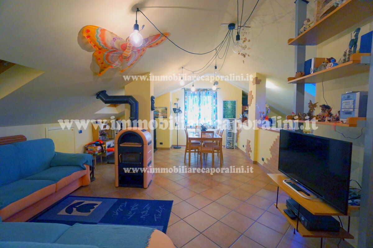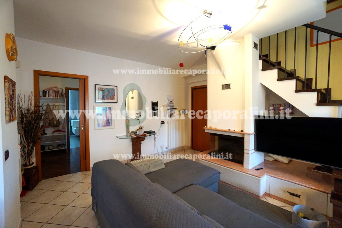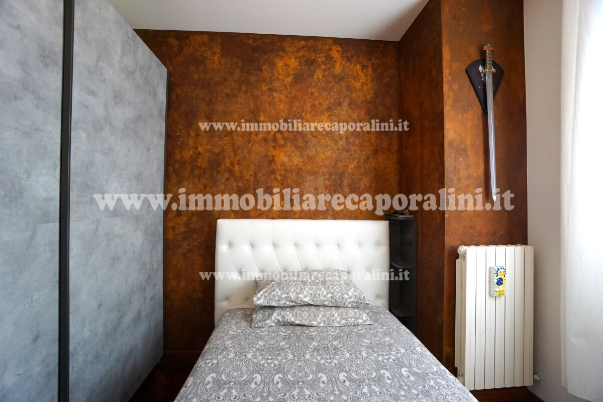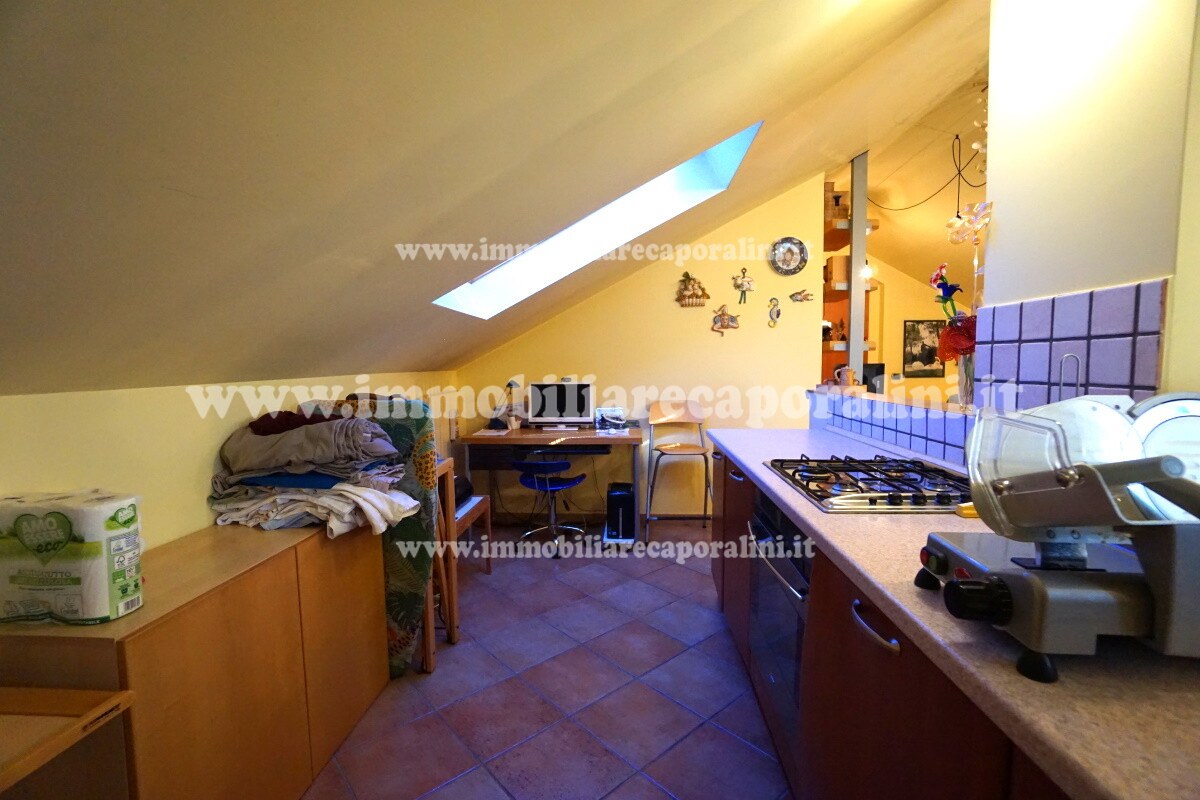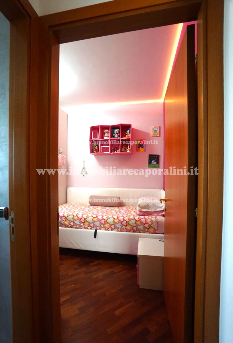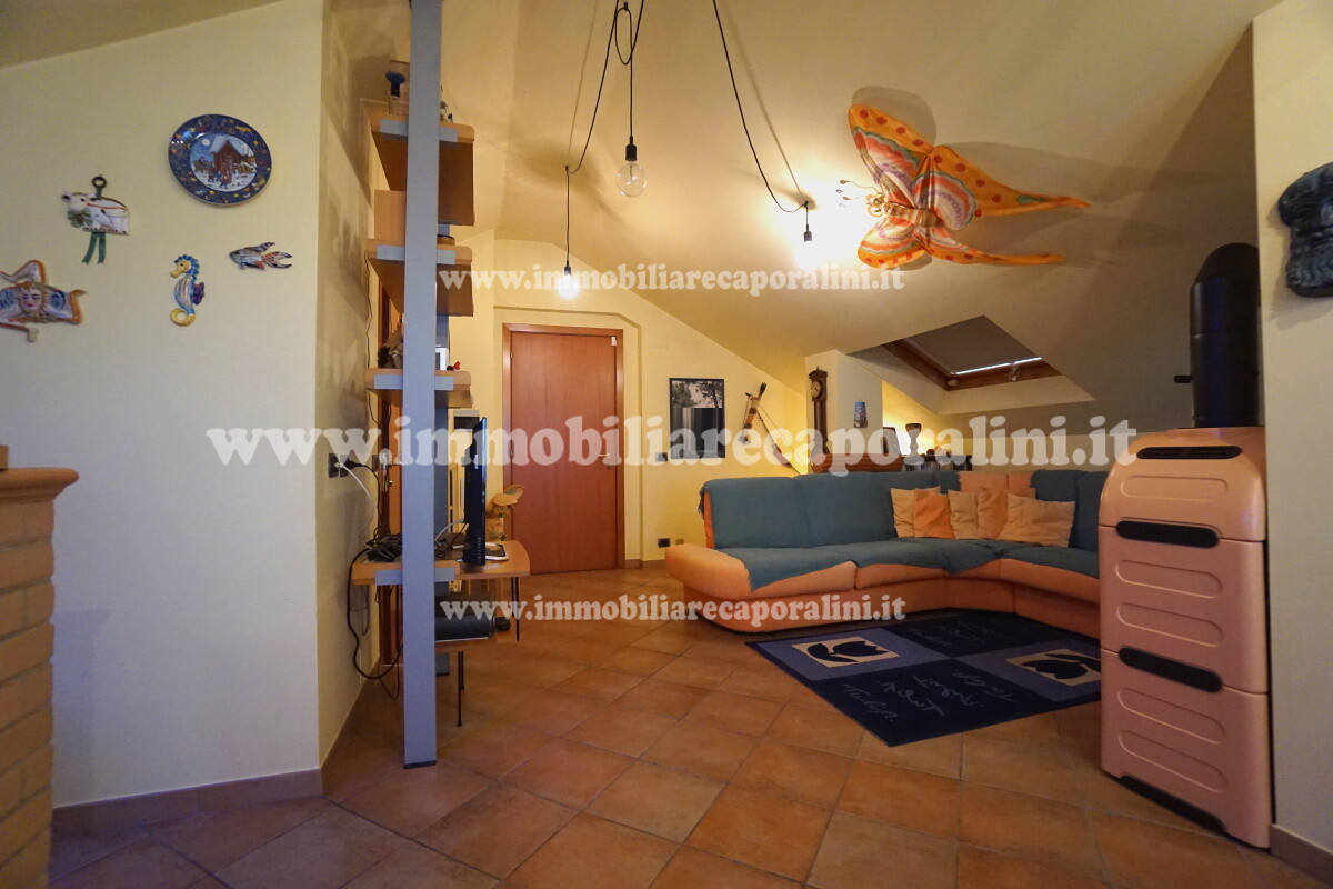L’Agenzia Immobiliare Caporalini propone in vendita a Montecassiano (MC): zona Sambucheto, abitazione su 2 livelli caratterizzata da appartamento di circa 90 mq al piano secondo (2) con scala interna di accesso al locale sottotetto annesso di circa 50 mq al piano terzo (3) più garage di circa 30 mq al piano primo sottostrada (S1). L’immobile è composto da: ingresso, zona cucina-soggiorno (open-space) con balcone e caminetto a legna ventilato, disimpegno zona-notte, 1 camera matrimoniale con balcone, 2 camere singole, 2 bagni, scala interna di accesso al locale sottotetto pluriuso (completo di impianti, di buone finiture interne, comprensivo di tinello-cucina e di bagno/lavanderia e di ingresso indipendente) e garage. L’immobile è dotato di: impianto di riscaldamento termoautonomo con caldaia a condensazione e termosifoni; climatizzazione estate/inverno per la zona soggiorno-cucina; pavimentazioni e rivestimenti in ceramica/gres-porcellanato e parquet; infissi in legno con doppi-vetri termici e zanzariere; portoncino blindato; 2 bagni recentemente ristrutturati a nuovo; caminetto a legna ventilato canalizzato con bocchette per la diffusione di aria calda per la zona soggiorno-cucina e per la zona notte; tenda da sole per il balcone della zona soggiorno-cucina; stufa a legna nel locale sottotetto; impianto di allarme; finiture esterne in mattoncino faccia-vista e intonaco. L’immobile si trova in ottime condizioni. Contesto condominiale. Palazzina dotata di ascensore. Costruzione antisismica con struttura portante in cemento armato. Classe Energetica “D”, EPgl,nren 91,40 kWh/mq anno. Zona residenziale e servita. Occasione!