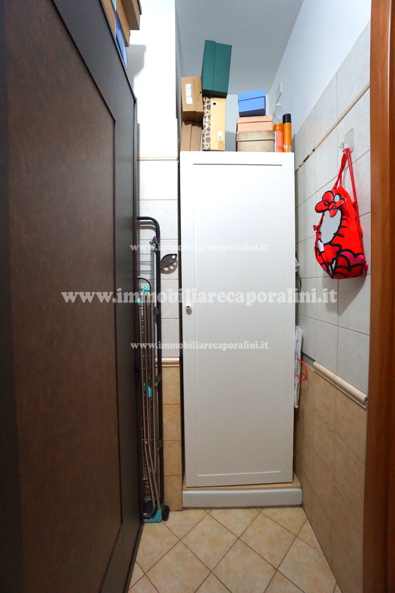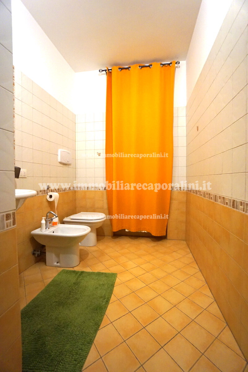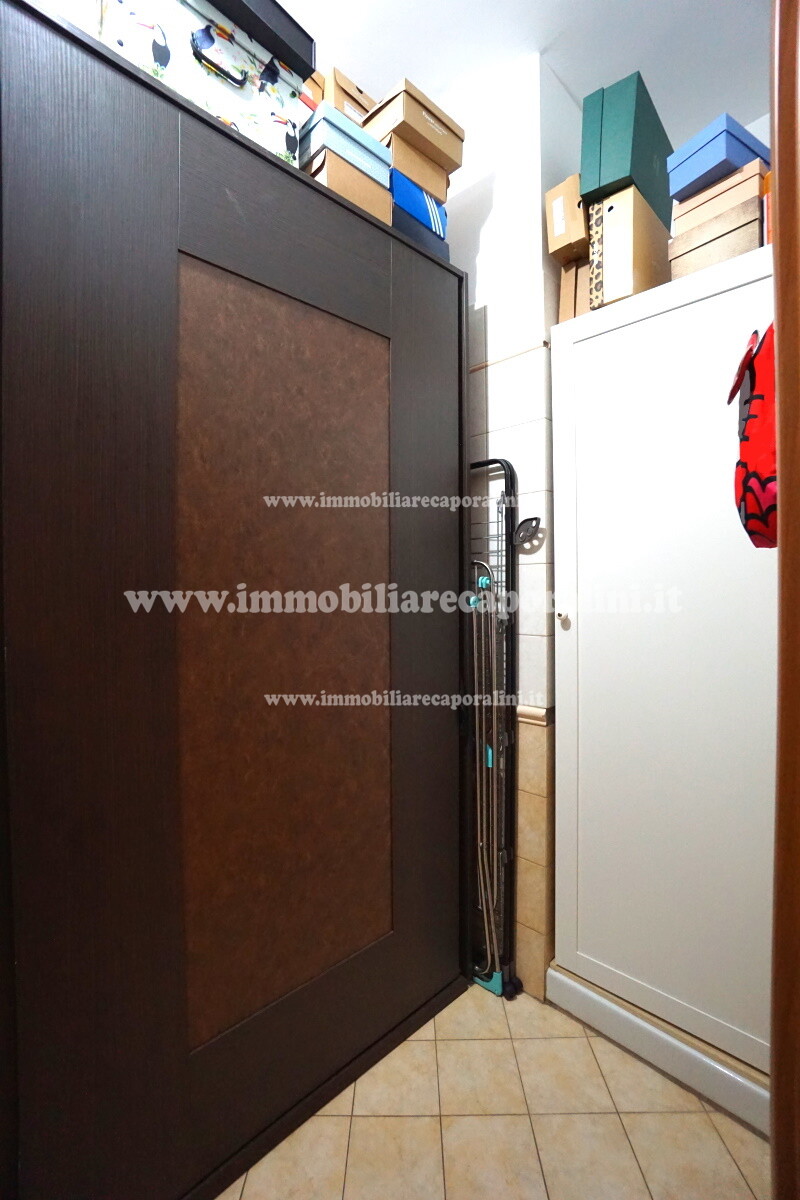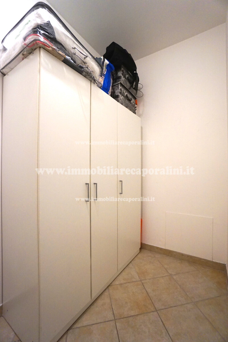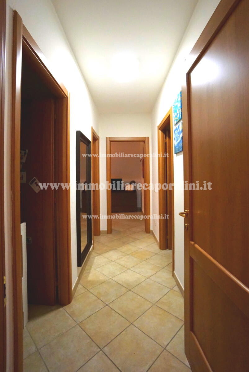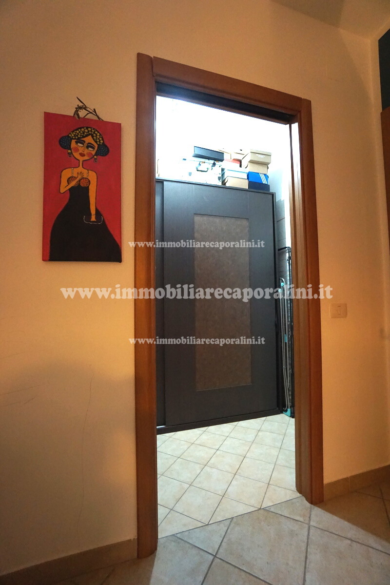 L’Agenzia Immobiliare Caporalini propone in vendita a Montecassiano (MC): appartamento semi-nuovo di circa 93 mq al piano secondo (2) con garage di circa 18 mq al piano primo (1). L’immobile è composto da: ingresso, zona cucina-soggiorno (open-space) con balcone di circa 4,5 mq, disimpegno zona-notte, 1 camera matrimoniale con bagno di servizio e balcone di circa 4,5 mq, 1 camera singola, 1 bagno, 1 ripostiglio e 1 garage. L’immobile è dotato di: impianto di riscaldamento termoautonomo con caldaia a condensazione a metano e termosifoni; infissi in alluminio con vetro-camera termica e persiane in alluminio; pavimentazioni e rivestimenti in gres-porcellanato e ceramica; portoncino blindato; bagno principale con vasca; bagno di servizio in camera con piatto-doccia; ripostiglio con spazio dedicato per lavatrice/asciugatrice; climatizzatore estate/inverno in zona soggiorno-cucina. Il vano adibito a bagno di servizio in camera matrimoniale può essere utilizzato come cabina-armadio. Palazzina dotata di ascensore. Costruzione antisismica con struttura portante in cemento armato. In attesa di APE. L’immobile si trova in ottime condizioni! Zona residenziale e servita; a poca distanza dal centro cittadino. Occasione!