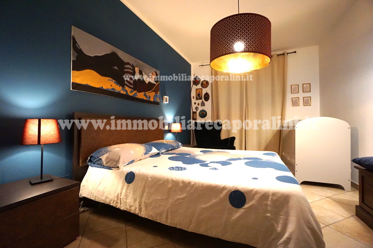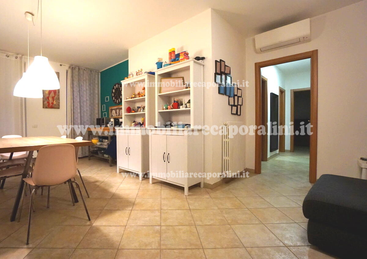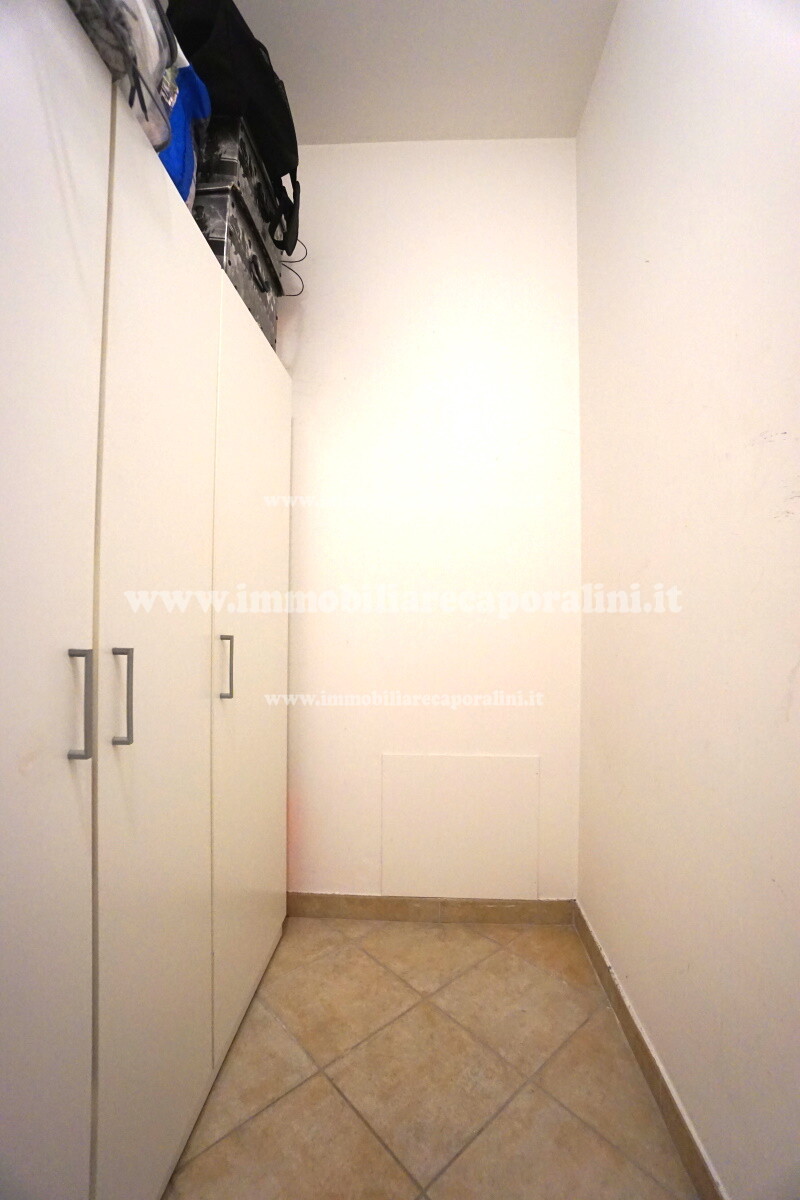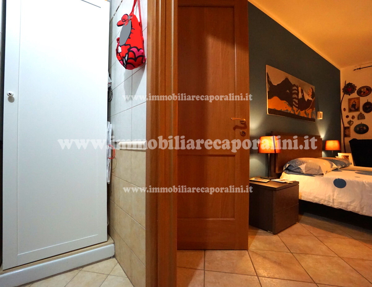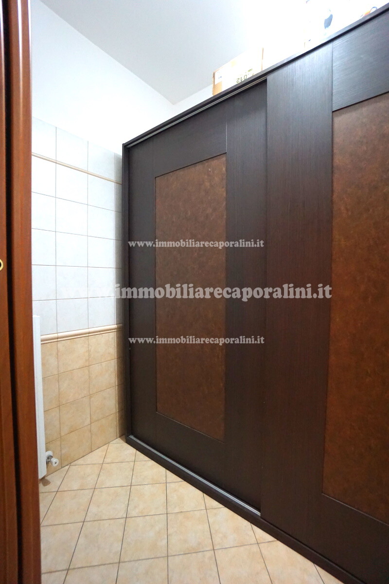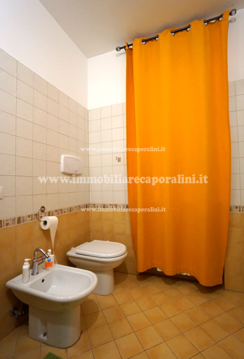 L’Agenzia Immobiliare Caporalini propone in vendita a Montecassiano (MC): appartamento semi-nuovo di circa 93 mq al piano secondo (2) con garage di circa 18 mq al piano primo (1). L’immobile è composto da: ingresso, zona cucina-soggiorno (open-space) con balcone di circa 4,5 mq, disimpegno zona-notte, 1 camera matrimoniale con bagno di servizio e balcone di circa 4,5 mq, 1 camera singola, 1 bagno, 1 ripostiglio e 1 garage. L’immobile è dotato di: impianto di riscaldamento termoautonomo con caldaia a condensazione a metano e termosifoni; infissi in alluminio con vetro-camera termica e persiane in alluminio; pavimentazioni e rivestimenti in gres-porcellanato e ceramica; portoncino blindato; bagno principale con vasca; bagno di servizio in camera con piatto-doccia; ripostiglio con spazio dedicato per lavatrice/asciugatrice; climatizzatore estate/inverno in zona soggiorno-cucina. Il vano adibito a bagno di servizio in camera matrimoniale può essere utilizzato come cabina-armadio. Palazzina dotata di ascensore. Costruzione antisismica con struttura portante in cemento armato. In attesa di APE. L’immobile si trova in ottime condizioni! Zona residenziale e servita; a poca distanza dal centro cittadino. Occasione!