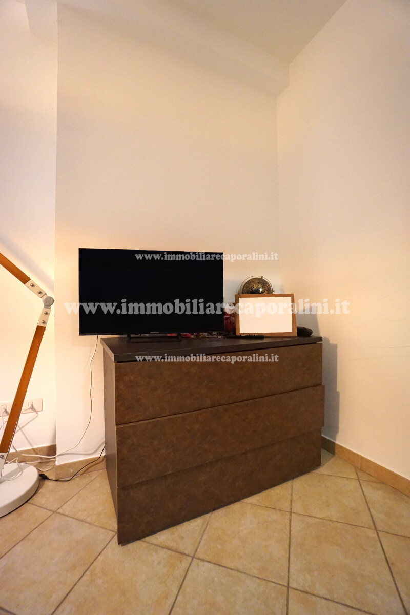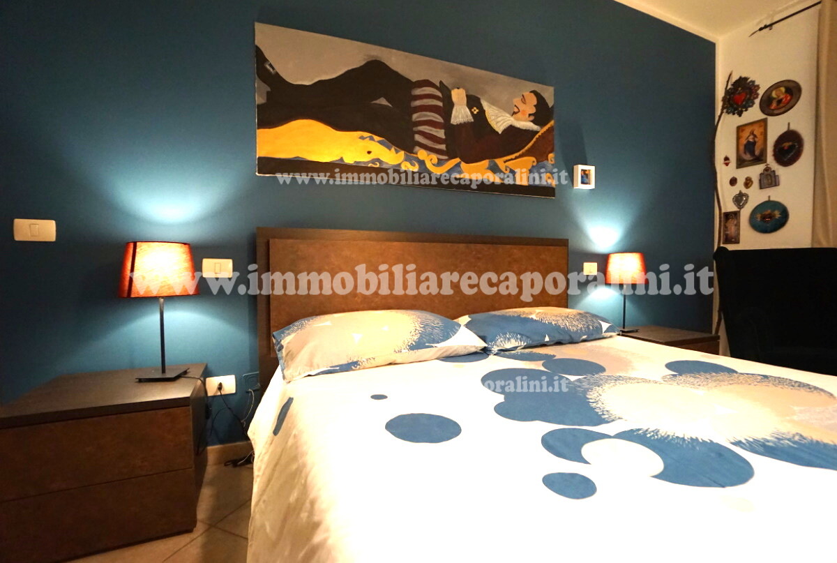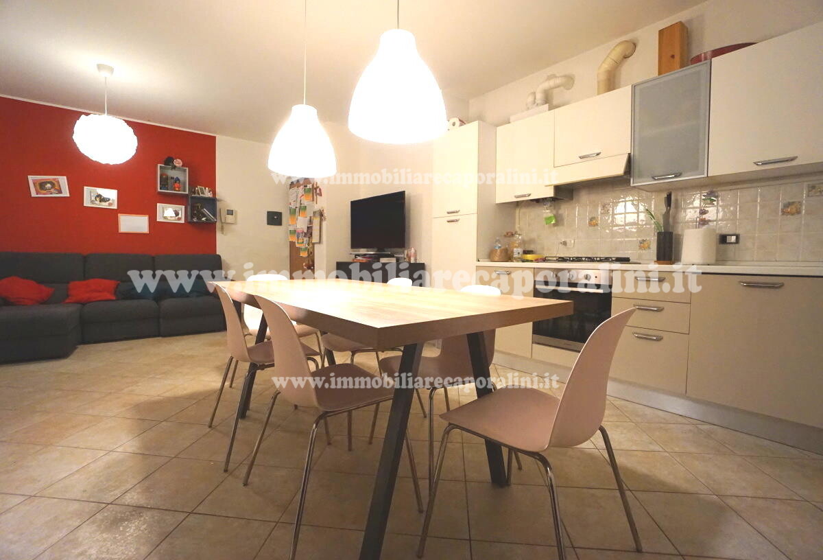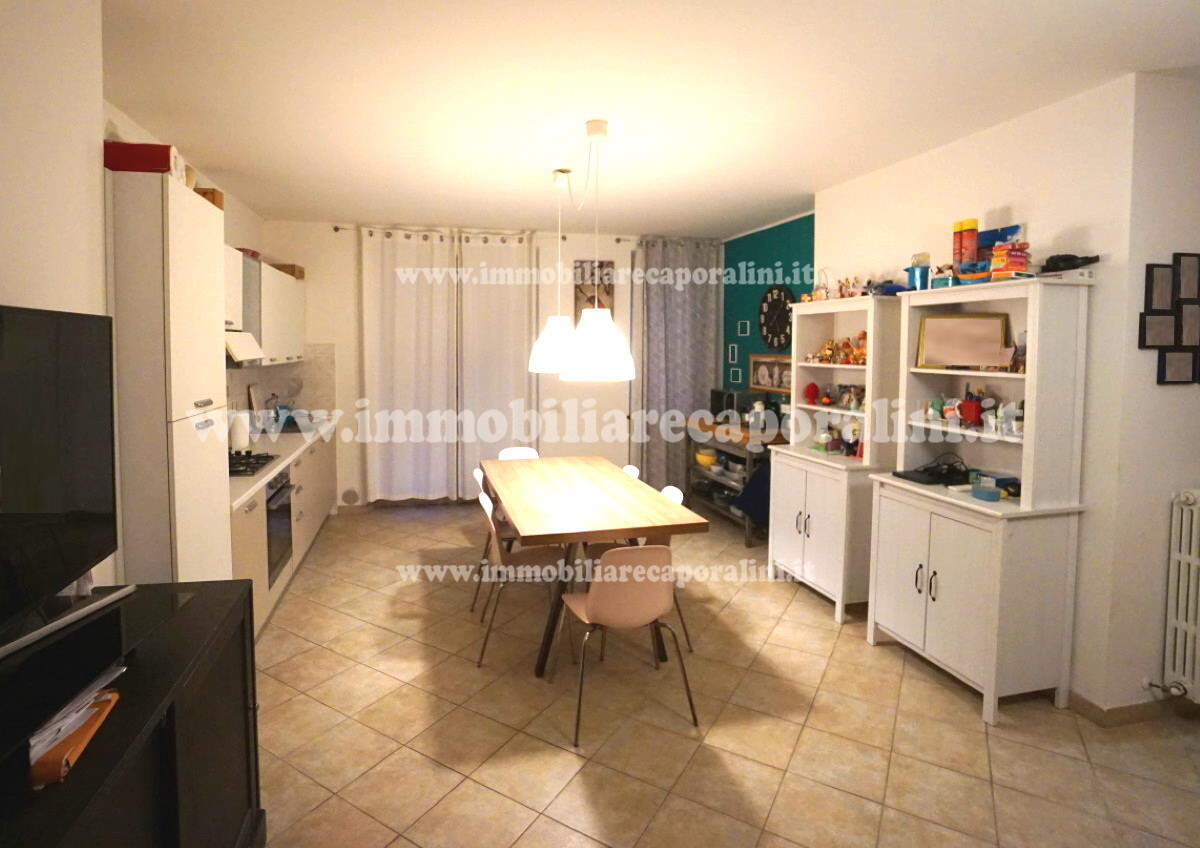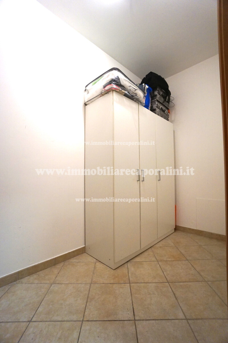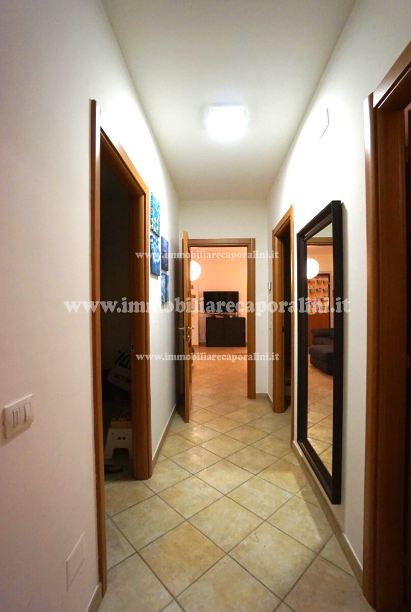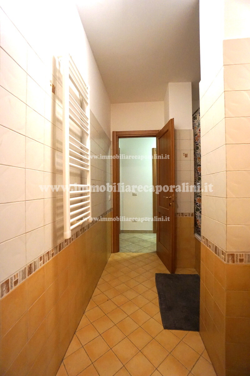 L’Agenzia Immobiliare Caporalini propone in vendita a Montecassiano (MC): appartamento semi-nuovo di circa 93 mq al piano secondo (2) con garage di circa 18 mq al piano primo (1). L’immobile è composto da: ingresso, zona cucina-soggiorno (open-space) con balcone di circa 4,5 mq, disimpegno zona-notte, 1 camera matrimoniale con bagno di servizio e balcone di circa 4,5 mq, 1 camera singola, 1 bagno, 1 ripostiglio e 1 garage. L’immobile è dotato di: impianto di riscaldamento termoautonomo con caldaia a condensazione a metano e termosifoni; infissi in alluminio con vetro-camera termica e persiane in alluminio; pavimentazioni e rivestimenti in gres-porcellanato e ceramica; portoncino blindato; bagno principale con vasca; bagno di servizio in camera con piatto-doccia; ripostiglio con spazio dedicato per lavatrice/asciugatrice; climatizzatore estate/inverno in zona soggiorno-cucina. Il vano adibito a bagno di servizio in camera matrimoniale può essere utilizzato come cabina-armadio. Palazzina dotata di ascensore. Costruzione antisismica con struttura portante in cemento armato. In attesa di APE. L’immobile si trova in ottime condizioni! Zona residenziale e servita; a poca distanza dal centro cittadino. Occasione!
